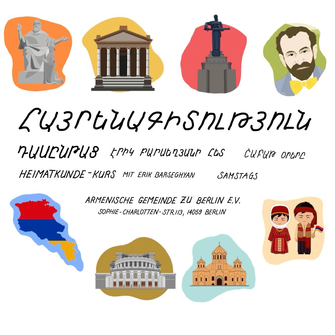Jeden Sonntag findet in der Armenischen Gemeinde zu Berlin e.V. (Sophie-Charlotten-Straße 113, 14059 Berlin) der Kurs ,,Heimatskunde” statt, geleitet von Erik Barseghyan – dem Dozenten des Staatlichen Instituts für Theater und Kinematographie Jerewan. Behandelt werden Themen rund ums Thema Armenische Kultur, Identität und historische Entwicklungen.